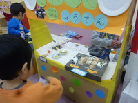 今日は子どもフェスティバルに向けて制作した「お店屋さん」を使って、