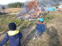 ひとりずつ、自分で作った正月飾りや書初めなどを火の中に投げ入れて